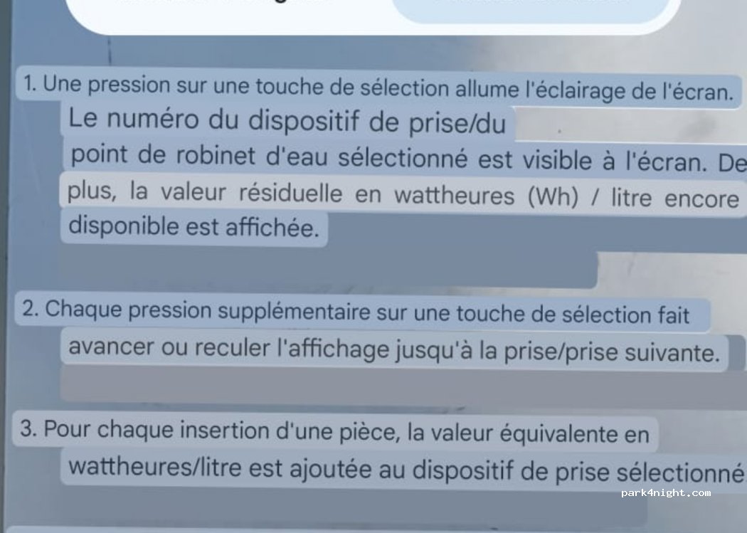 Vlakken voor de campers zijn niet recht; zelfs met levelers niet recht gestaan. Water is gecompliceerd. Geen prullenbakken aanwezig. Stroom werkt wel. Maar 10€ voor zo'n troosteloze, scheve plaats met niets anders dan een zwembad in de buurt is brutaliteit. Het is dan we echt stroom nodig hadden voor de nacht.... PS. de rest van de parkeerplaats is kostenloos, dus alleen campers worden belast.