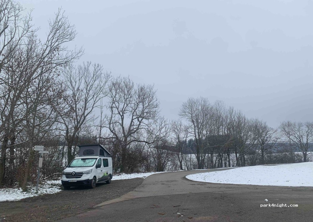 Unmittelbar an einem Straßendreieck gelegen. Etwa alle 15 Minuten ein Fahrzeug. Keine Abgrenzung zwischen Stellplatz und Straße. Für eine Nacht ok, da nicht sehr weit von der Autobahn entfernt. Sehr ruhig. Keine Infrastruktur.