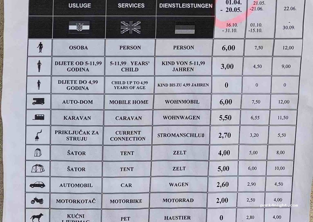 Prima, alleen een korte overnachting stop gemaakt. Vriendelijke eigenaar. Prima voorzieningen. 184 kuna betaald voor 1 nacht incl. stroom.