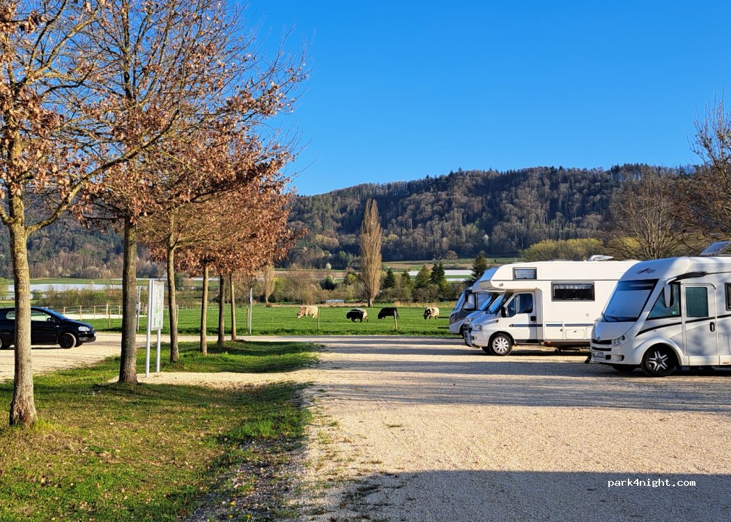 Perfekter Ausgangspunkt für Rad- und Wanderungen an den Bodensee oder in die Schweiz und im Sommer zum Baden im Naturbad. 12€ incl. Gästekarte pro Nacht, bezahlbar mit Parkster-App o. Bargeld. 24 großzügig angelegte ebene Stellplätze, Stromversorgung und V+E, Aussentoilette kann während der Badesaison kostenlos benutzt werden. Bäckerei und griech. Gaststätte sowie Bankomat fußläufig zu erreichen.