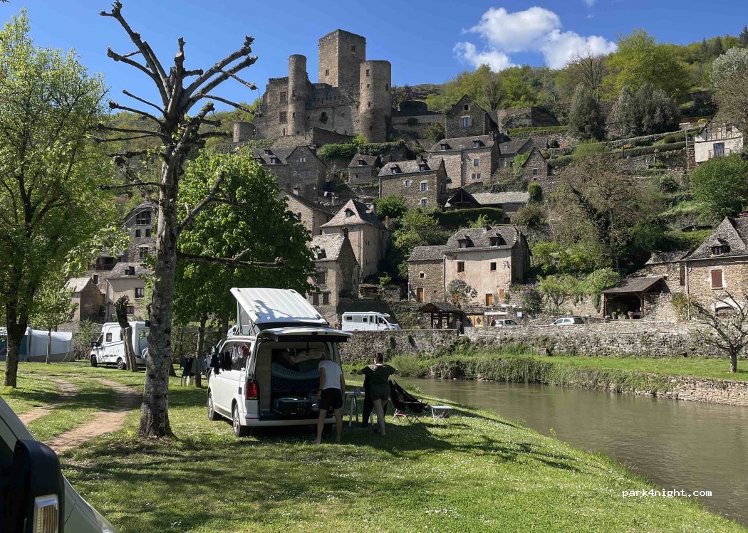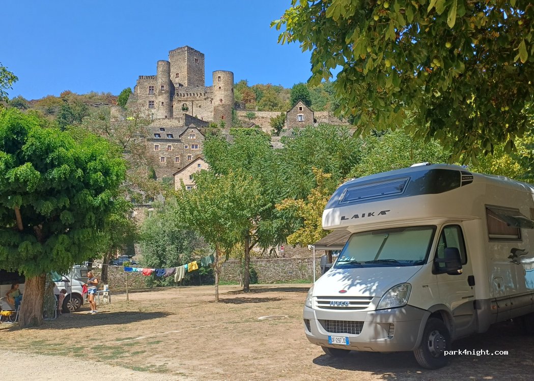 Camping municipale davvero delizioso, 4 persone + camper + elettricità 19.60 € per 1 notte (compresa la baguette fresca ordinata al nostro arrivo). Piazzole in erba direttamente sull'Aveyron con vista sul paesino medioevale con il suo castello. Servizi non nuovi ma puliti ed efficienti. Super super consigliato.