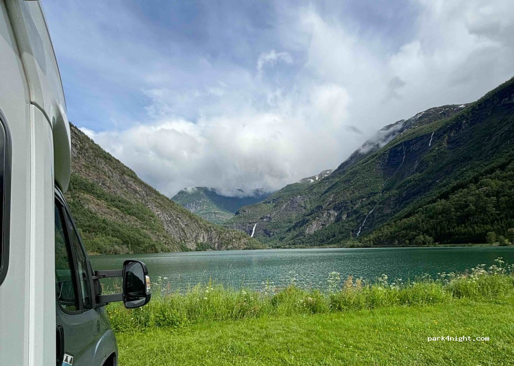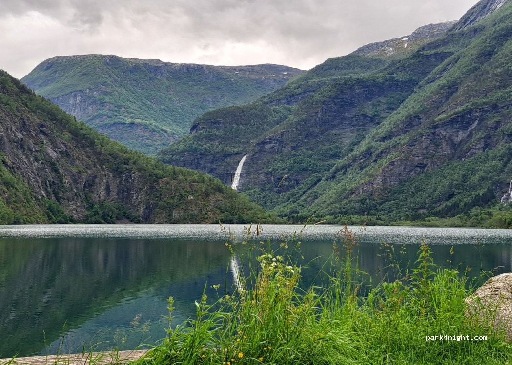 Ein sehr schöner Platz mit toller Aussicht auf den See und mehrere Wasserfälle. Top gemähte Wiese. Der Sanitärbereich ist ok, aber ein bisschen in die Jahre gekommen. Aber für ein oder 2 Nächte ist der Platz super. Kosten für ein Womo betragen 380 nok inkl. Strom & WiFi. Duschen 10nok für 4 Minuten. Das WiFi ist aber eher bescheiden.