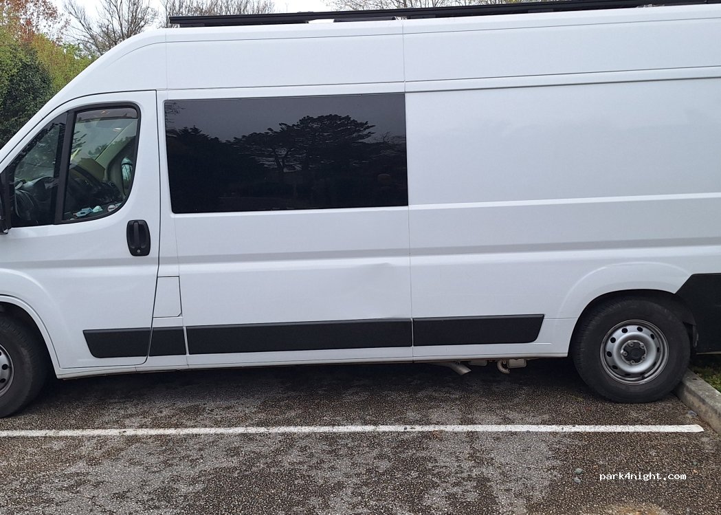 Stopped 1 night with 5.4m van, just about enough length backing up on the grassy side. it is true that you hear muffled sound of motorway traffic, but otherwise quiet, we slept well. 15 minutes walk down to beach and bars.