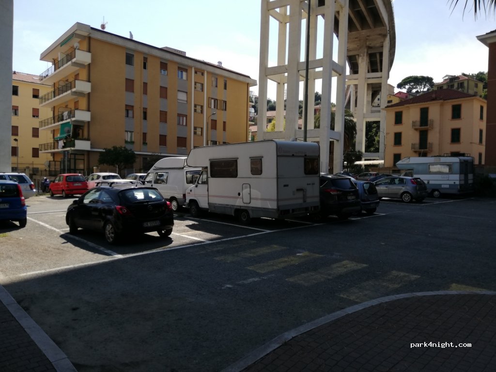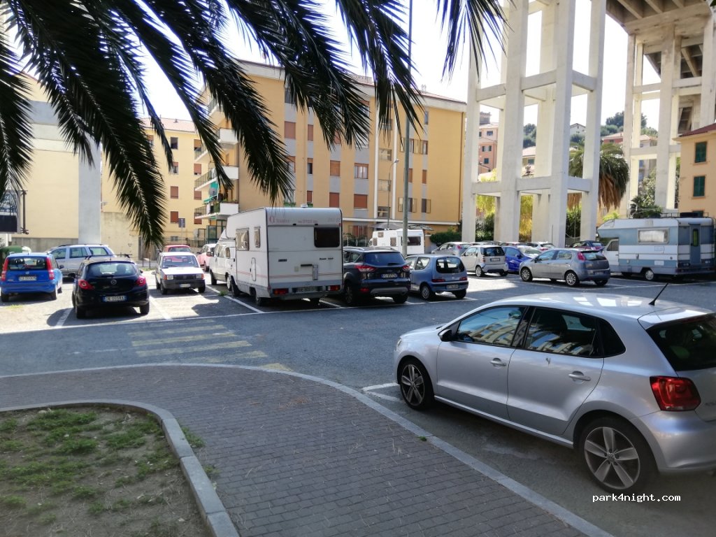 Grand parking sous un viaduc, calme ( j'y suis au 30 septembre). très proche du centre , gratuit, poubelles à proximité.