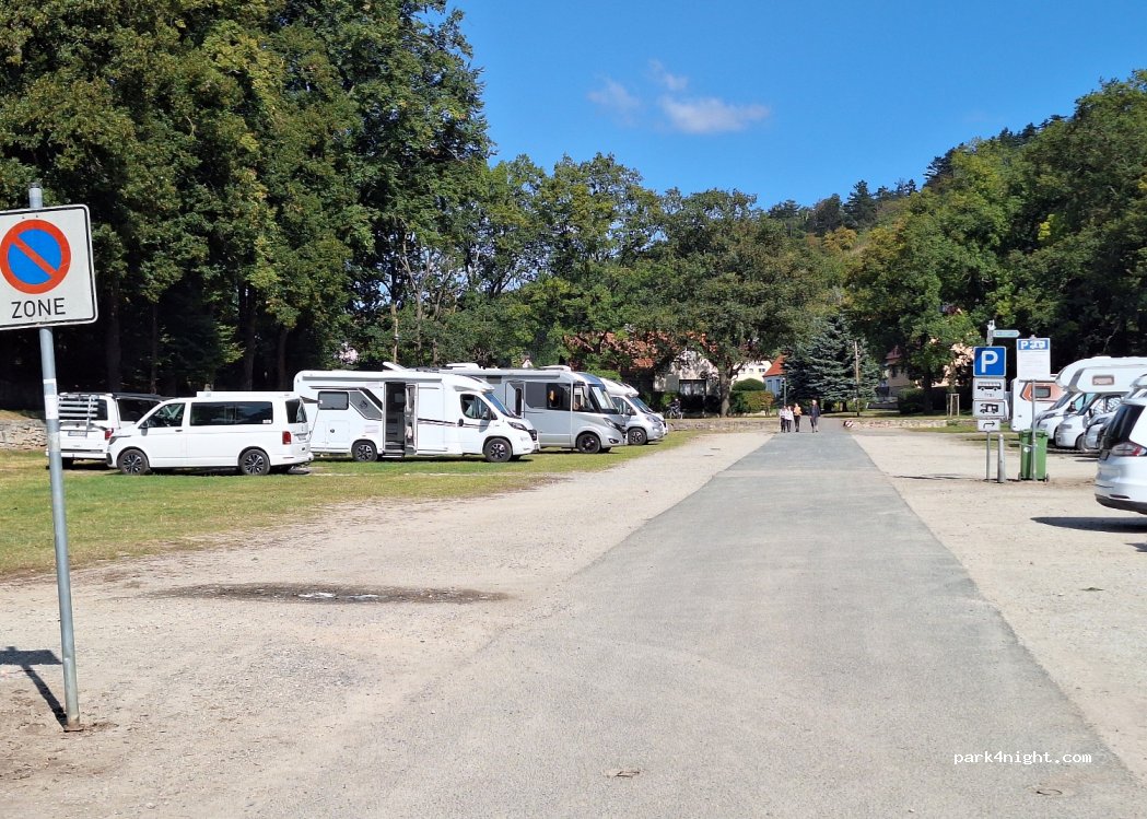 Einfacher Parkplatz (ohne jeglichen Service) für Wohnmobile und Caravan hauptsächlich auf Wiese. Ruhige Lage. WC hat von 7:00 bis 19:00h geöffnet. Kleines nettes Städchen mit versch. Gaszronomie. Wanderwege zur Burg starten direkt beim Parkplatz .