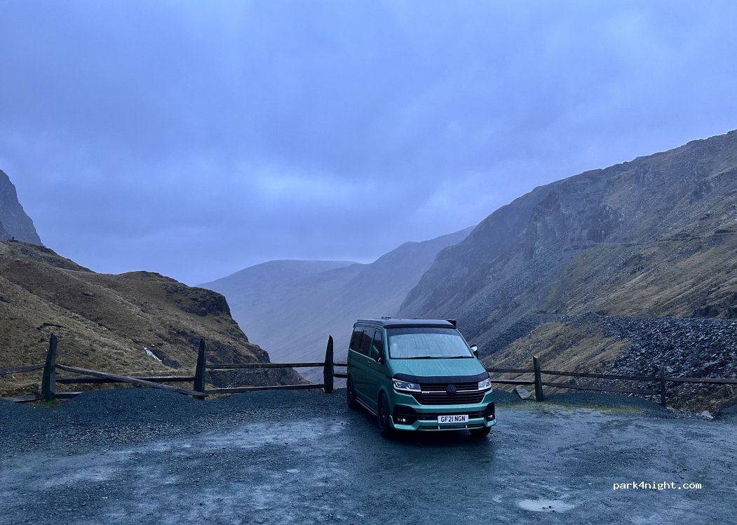 Ignore the comment that says you can't park here, we paid £10 to park here overnight. Absolutely stunning views with great walks. You can get to dubs hut from here with a short hike. We also enjoyed a tour of the slate mines which was really interesting.
