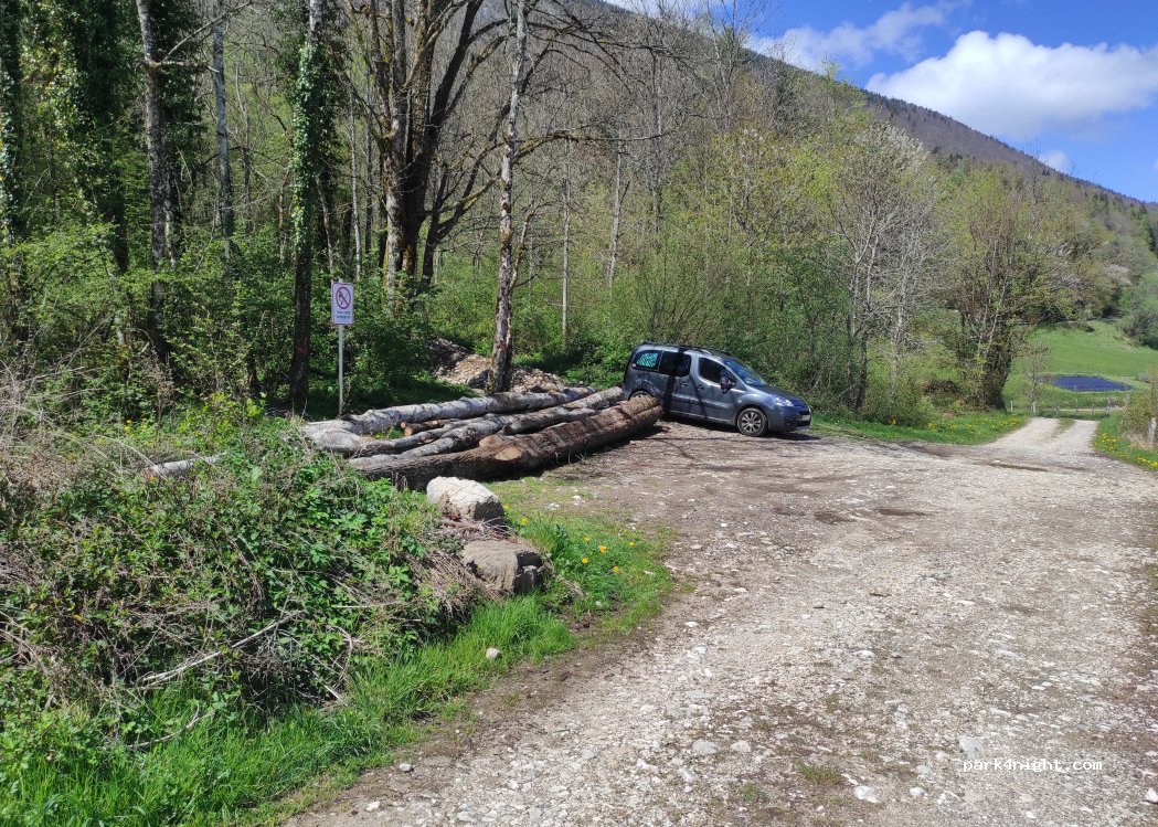 Chemin forestier à emprunter sur 200 m pour trouver un "parking". A gauche, à la sortie de Saint Jorioz direction Leschaux. Possibilité d'avoir une vue sur le lac. L'endroit est très calme et relativement plat. Cet endroit est propice au bivouac donc pour la nuit uniquement, c'est préférable même si pas d'interdiction.