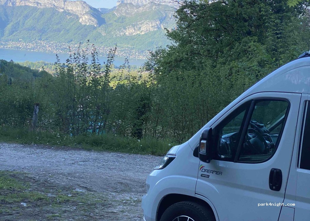 Petite place très au calme sur les hauteurs de Saint Jorioz, petite vue sur le lac, mais derrière la haie. Très calme. Nous étions avec un autre van. Il y a de la place pour 2/3 vans maxi. Idéal par sa proximité avec Annecy.