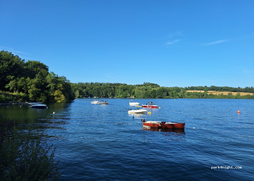 aire de parking aménagée arbres et herbe tondue plusieurs place pour s'installer . pas de barrière à l'entrée.acces à 5min à pieds du lac. en bord de route mais très calme Un