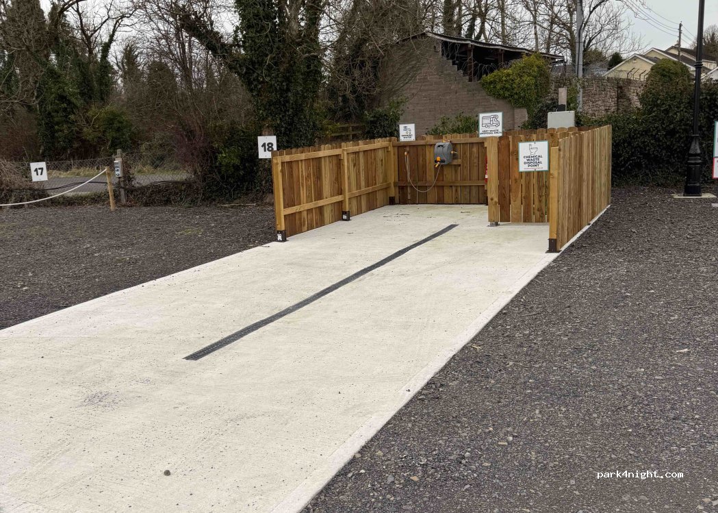 What a great little place in a great setting. There is a couple of pubs, Chinese takeaway, fish and chip shop and a great supermarket all within 2 minutes walk from the site. fresh water, grey and black waste and rubbish bins. The owner is easy to talk to and very helpful. the number to call is on the small office door by the fuel pump at the gate. €14 per night with EHU