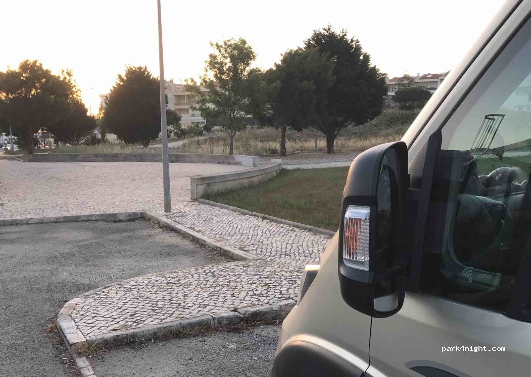 The only place we found in Ericeria that was flat and didn’t have a height barrier. Great nights sleep, felt very safe to leave during the day and night as surrounded by beautiful motels. 5-10 minute walk to restaurants and bars. No signage saying we couldn’t park here but the motel staff looked a little unimpressed. Room for 3 campers.