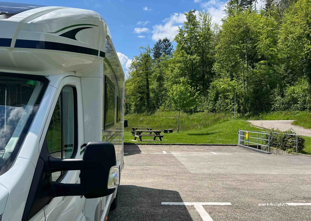 Personne d’autre que nous sur le parking, endroit très calme, vue magnifique ! Le bruit du train ne nous a pas dérangé. Il y a deux tables avec des bancs juste à côté.