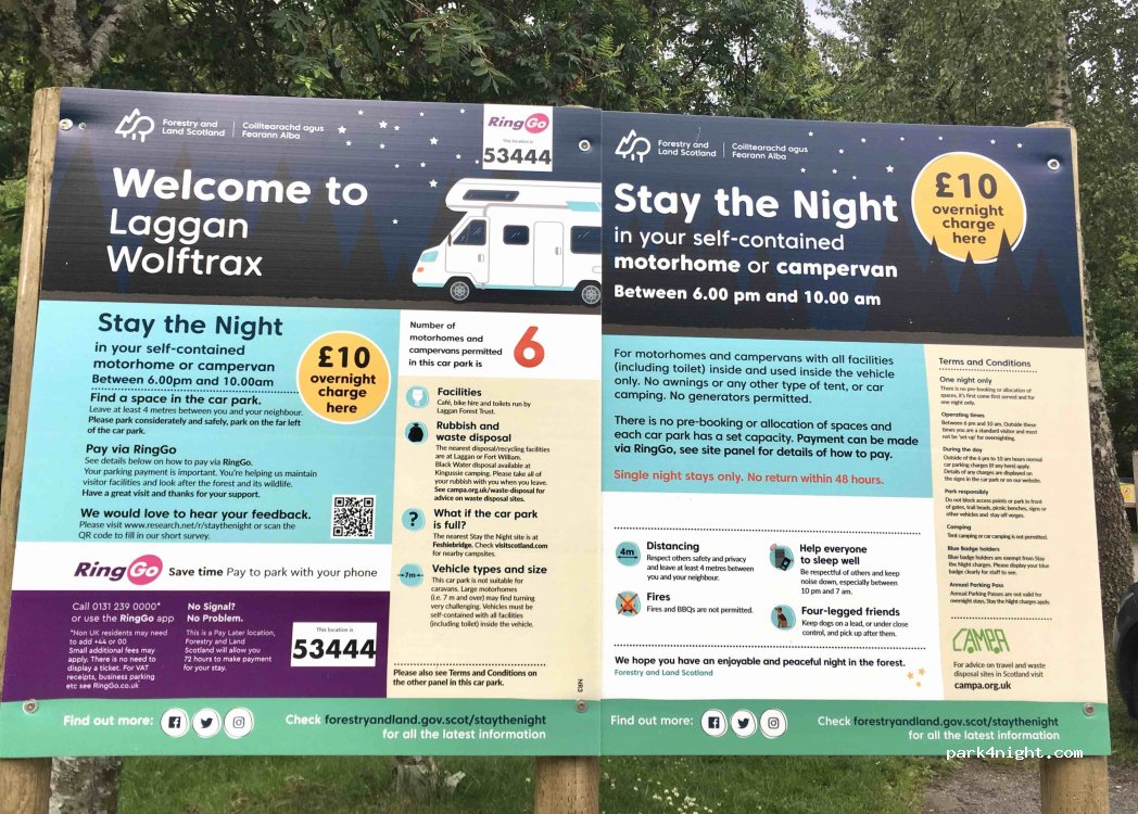 Parking in the center of Laggan Wolftrax. Card payment at the machine is not always possible, but you can also pay the parking fee in the café. Cafe open from 10am to 5pm.