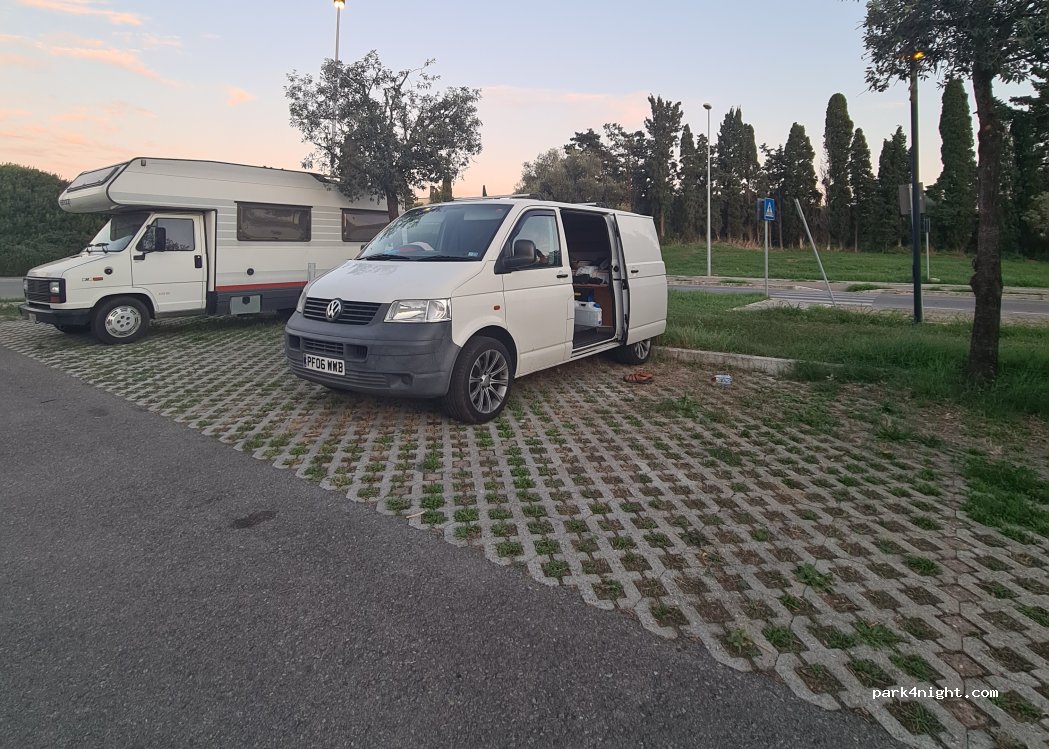 Espacio básico sin servicios pero con pernocta tranquila y segura. Hay un Coop (super) al lado que sí que tiene lavabos gratuitos. A 10 minutos en coche de Orbetello, pueblo muy recomendado para visitar.