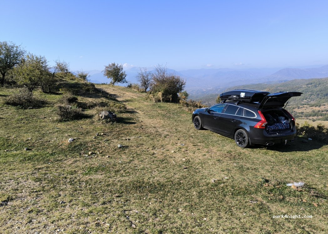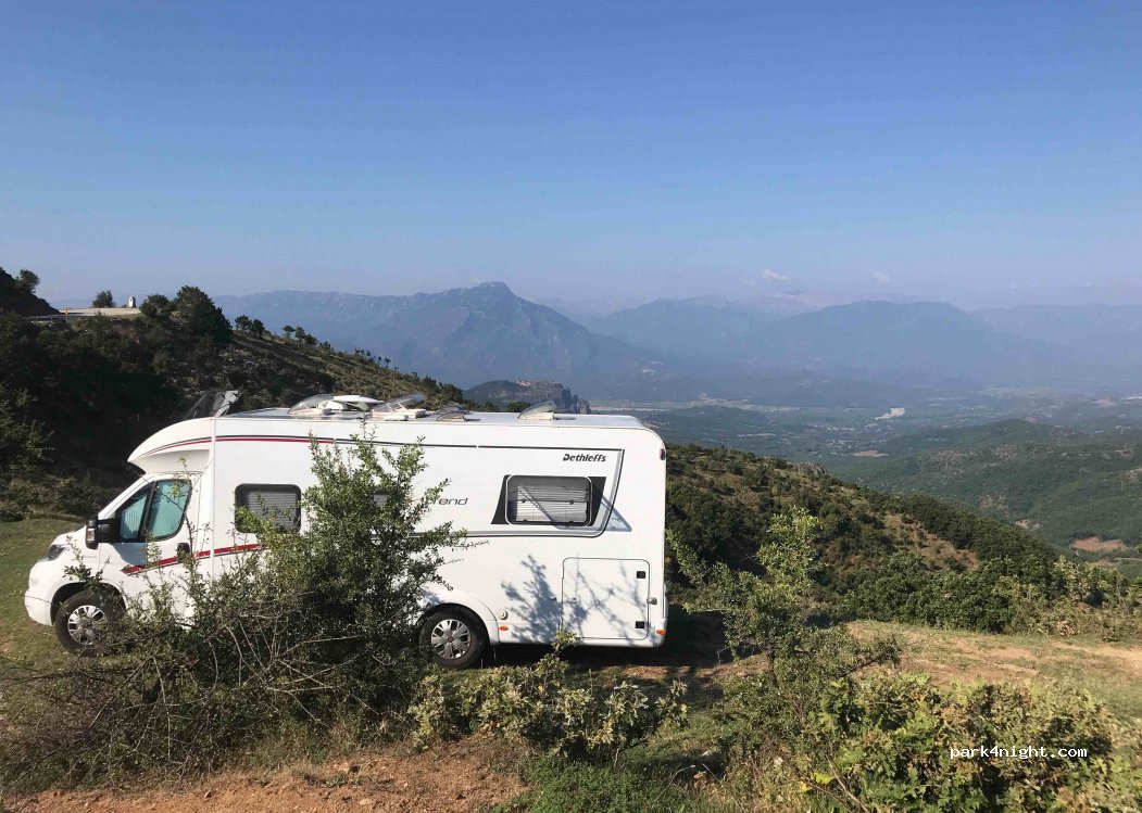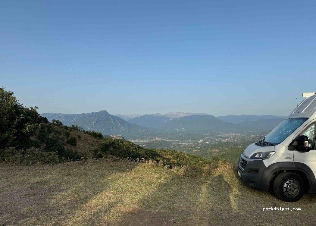 Très bel endroit, à côté de la route mais très calme la nuit. Vue idyllique sur la plaine et la montagne ainsi que sur le Grand Météore, qui est seulement à quelques kilomètres de là. Idéal pour la visite des Météores. Convient pour un gros camping-car.