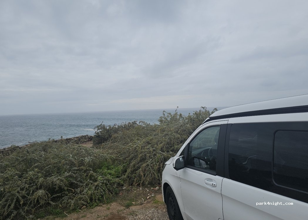 Aparcamiento pequeño, pocas plazas y un poco desnivelado, pero perfecto para pernoctar con vistas al mar.