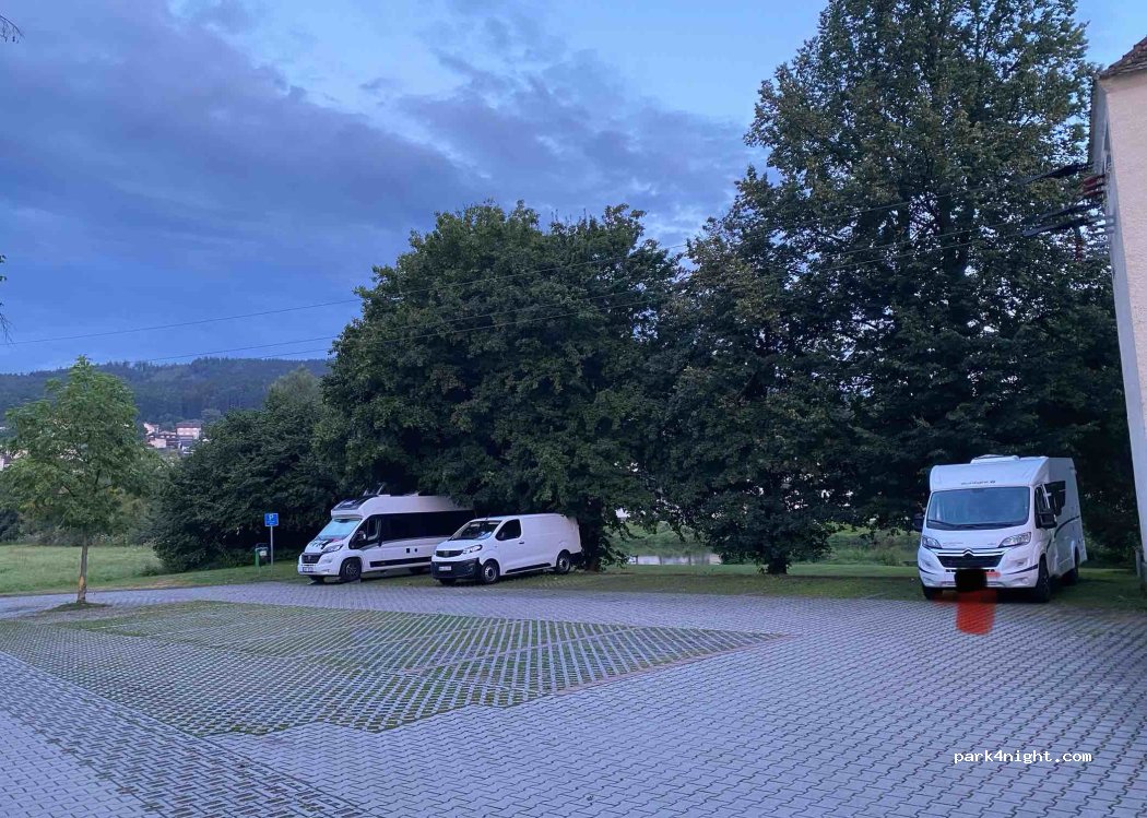 Parkplatz zwischen Kirche ( Friedhof ), Kindergarten, Rathaus und Regen. Öffentliche Toilette, Grill-/ Feuerstelle und Einsetzstelle für Kanu vorhanden. Sehr ruhig und trotzdem zentrumsnah ! Bäcker/Metzger und das Lokal „Bäckerwirt“ sind zu Fuß in 2-3 Minuten erreichbar. Zum Bahnhof sind es ca. 5 Minuten.