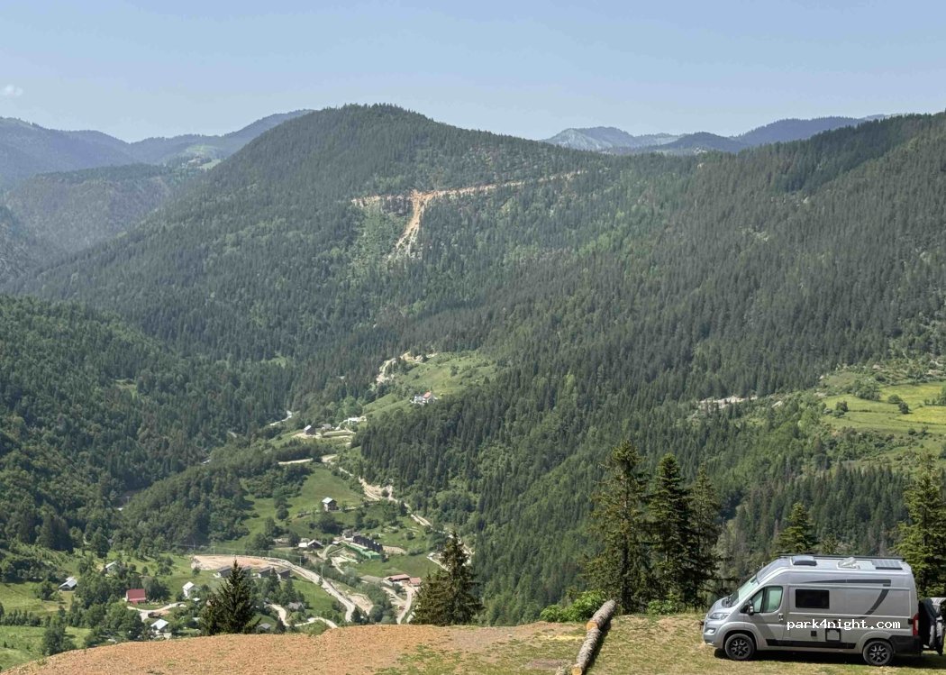 Auch mit unserem 7.5t Fahrzeug und 3.55m Höhe war die steile Auffahrt gut machbar. Oben angekommen, durften wir beim Restaurant recht eben stehen. Grossartige Weitblicke in das Rugova Tal. Für den Platz wurde nichts verlangt, aber Ehrensache, dass wir dort ins Restaurant Essen gingen. War lecker und wir hatten eine ruhige Nacht.