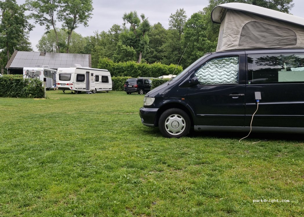 y avons suivis une famille Allemande, avec qui nous avons fait connaissance sur un autre emplacement... bon, comme nous n avions pas réservé au préalable, le gérant nous a fait rentrer, une petite place devant le cour d eau, mais nous avons eu accès aux sanitaires, machine à laver.. belle balade en bateau.