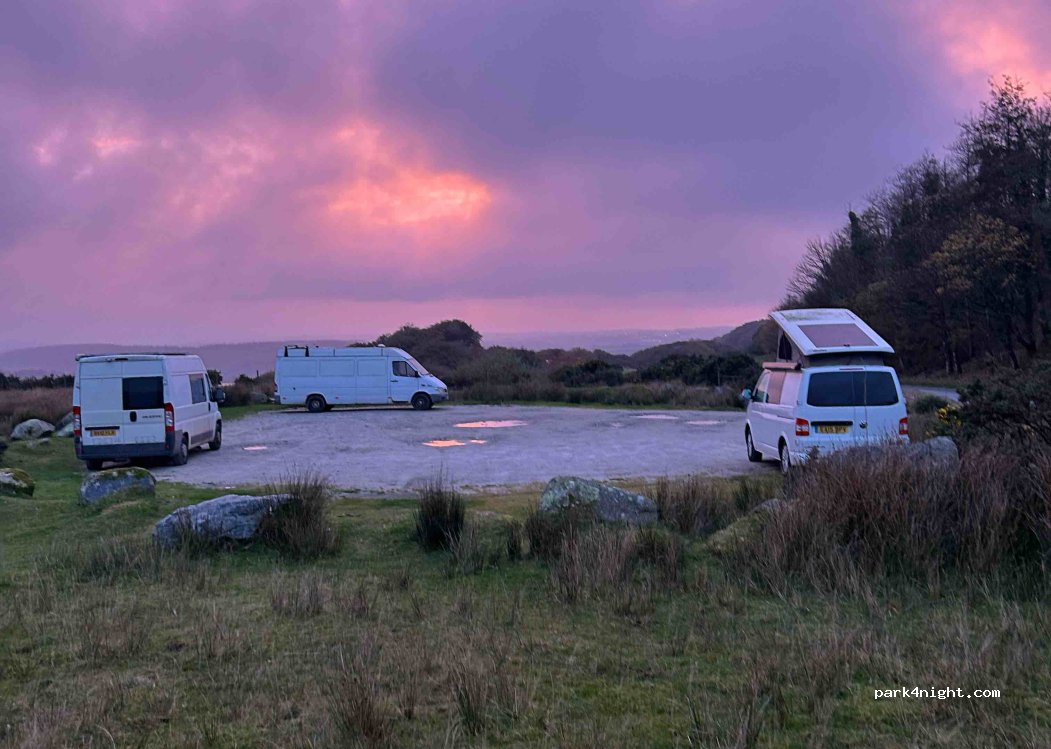 Amazing views quiet level gravel car parking for quite a few vans. wake up to sheep and horses and I swear we saw the beast of Bodmin up there!! Good roads in for a large motorhome no height or width restrictions other than the narrowish country lanes you find anywhere like this. There is even a little picnic table for dinner and good 4g reception