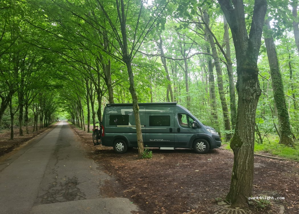 parking tranquille j'y viens des que je passe voir mes parents. c est tout droit (en face du complex) il y a quand une grande montée avant d'y accéder il faut pousser le moteur il n'y a pas de limite de taille moi je m'y gare en poids lourd le Poney Club et le terrain de BMX sont à 2 minutes à pied. tenez vos chiens en laisse pour éviter les problèmes (promeneur jogger cycliste....)