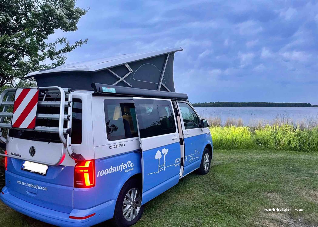 Superbe endroit au bord de l’eau avec tables de pic nic. Gravier ou herbe pour se mettre. En prenant votre vélo (ou à pied pour les courageux avec enfants) à 1km en continuant sur votre gauche il y a un chemin qui mène à une petite plage de sable à l’eau clair et où les locaux viennent se baigner! C’est superbe et l’eau était parfaite! Nous étions 6 cette nuit mais il y a de l’espace. Très calme.