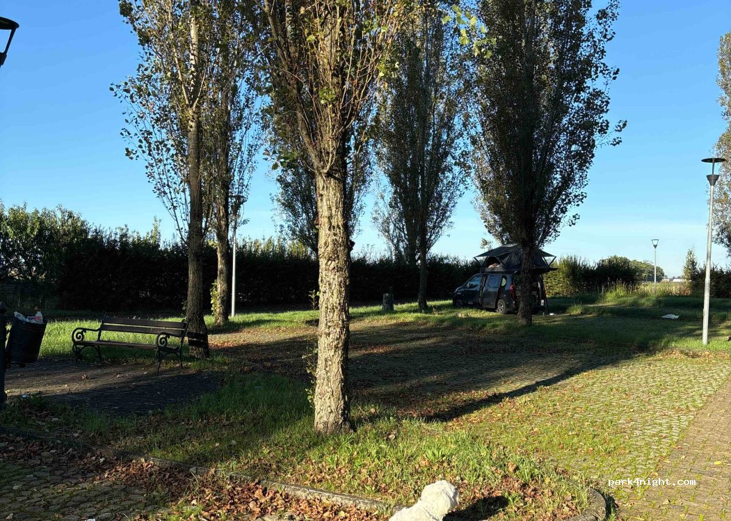 Grote parkeerplaats nabij Villa Verdi. Toiletten, vuilnisbakken.