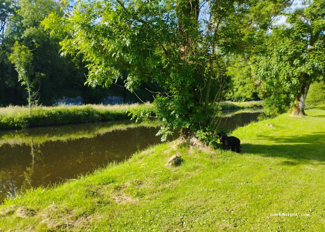 Un endroit calme et reposant, au bord de la rivière, nous sommes les seuls sur le Camping, je n’ai pas encore vue la personne qui passe pour le règlement, à priori 9€ pour un CC 2 pers avec électricité. C’est super !