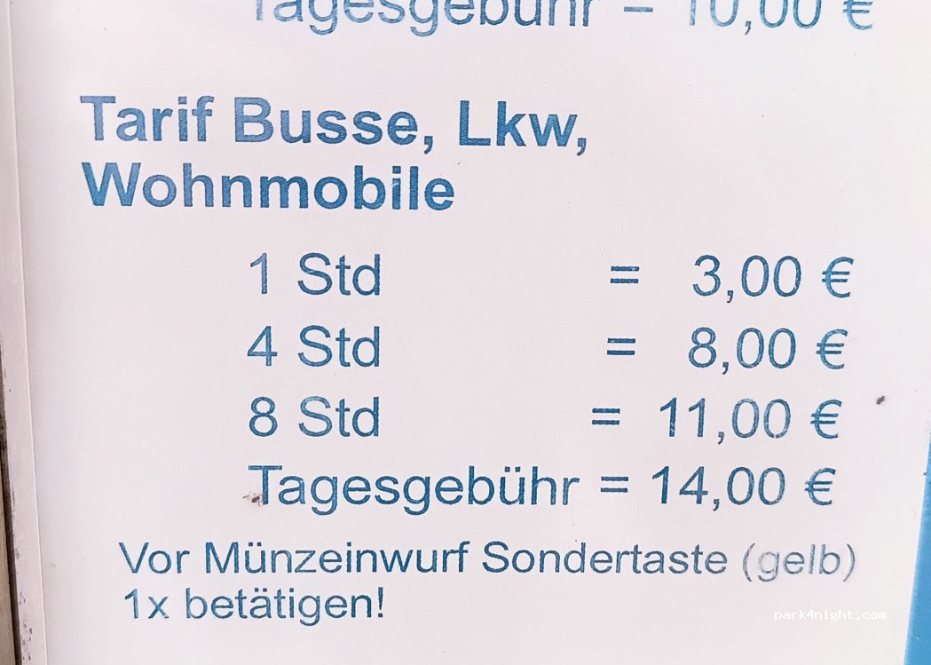 Parkt bloß nicht zwischen auf den Busparkplätzen! Wir wurden rüde !! nachts geweckt und mussten den Parkplatz räumen. Begründung war Auslegung der STVO nur für Busparkplätze mit Verweis auf die umliegenden Campingplätze... Also wer Nachts schlafen will bzw. keine Stress mit Betreiber haben möchte , sollte woanders hin.... War sowieso zu laut an der Bahnstrecke !