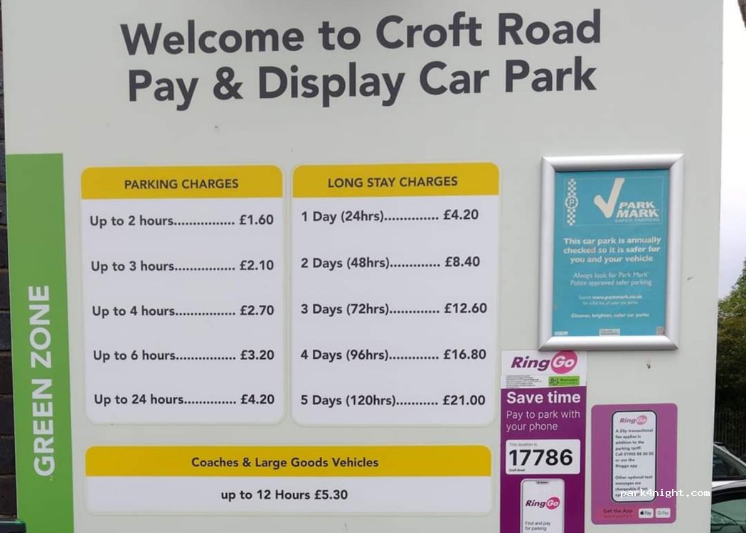Not a bad place to park up. Close to town centre. Was a bit noisy at night due to the cars racing up and down and revving of engines but I was young once £3.80 for 24hrs. Will go again