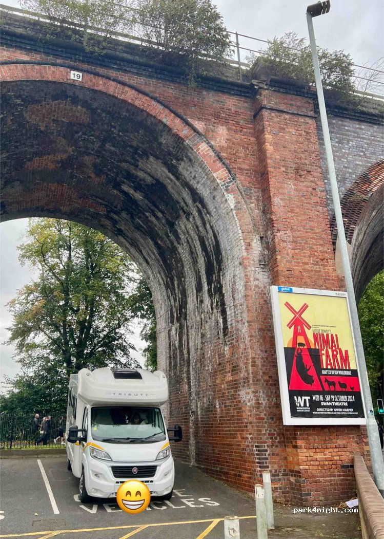 September 2025 £4.50 for 24 hours parking. Our LWB Transit fitted nicely under 3rd arch along from road. The arch nearest road is very sloped, the one we chose not too bad. Take 20p's for toilets, no card option. 5 mins walk past The Hive and in centre of Worcester. Didn't stay overnight just all day parking but would happily have stayed. Don't forget earplugs if train noise bothers you.