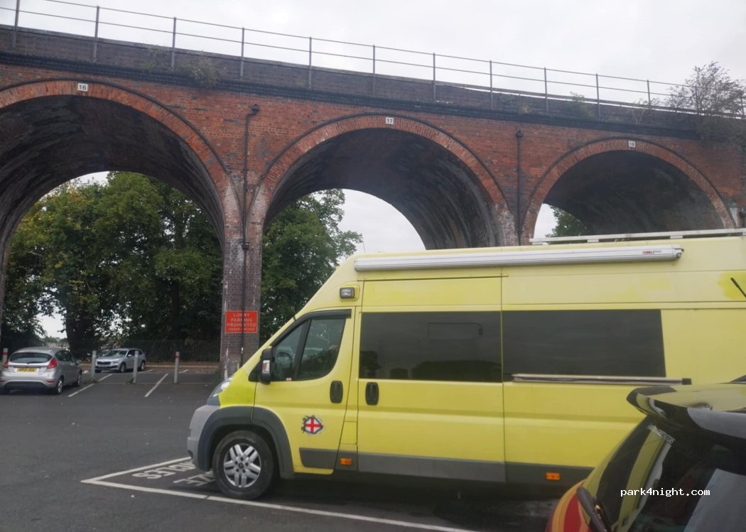 nice place to stop 5 min walk to town center. public toilets 1 min walk open around 0730. downside lots of road noise, plus trains over viaduct. if parked in arches, it's quite a slop. I move to the other bays later. would use it again as heavy sleeper, it didn't really bother me, but the other half complained.