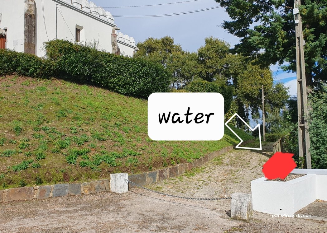 Rue sans issue avec aire de retournement, vue panoramique et petits espaces de repos en briques, au-dessus du camping (fermé en décembre), en dessous d'une église avec un petit parc. Superbe vue sur Goís, à droite un sentier avec des escaliers descend dans la ville. La ville propose une connexion Wi-Fi gratuite. Nous avons passé une nuit tranquille, personne/pas de voiture ici, en été, cela peut être très populaire et animé. Poubelles débordantes, pas de service, juste le calme et la tranquillité et une vue.