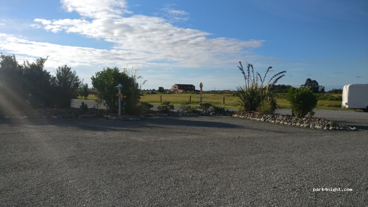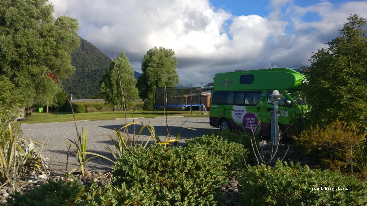 Haast River Motel And Holiday Park. Camping to be paid. Places with electricity or not. A little near the road, not an amazing view. Barbecue, kitchen, living room, TV room, clean bathroom with hot showers, 500mb of data per person, emptying station, games for children.