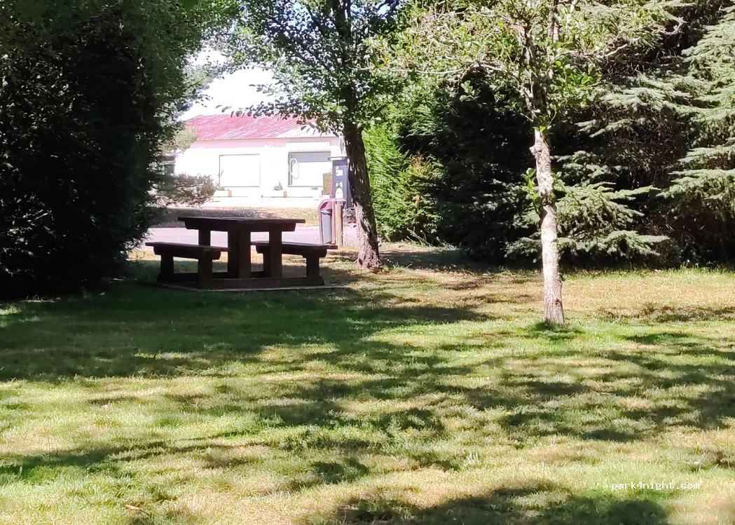 Pause déjeuner impeccable Même Si en camping car nous n' avons pas pu passer la barrière, on avait de la place pour se garer avant. Agréable de manger à l ombre des arbres par cette chaleur. Joli coin de verdure. Santiraires appréciés
