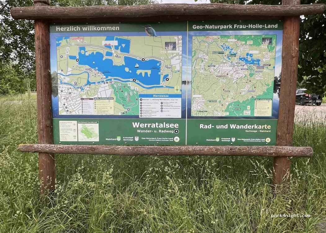 Beau parking public gratuit directement à Werratalsee. Seule limite: seulement jusqu'à 3,5 t. Nombreux sentiers, voir photos. L'autoroute fédérale à proximité ne prend pas était.