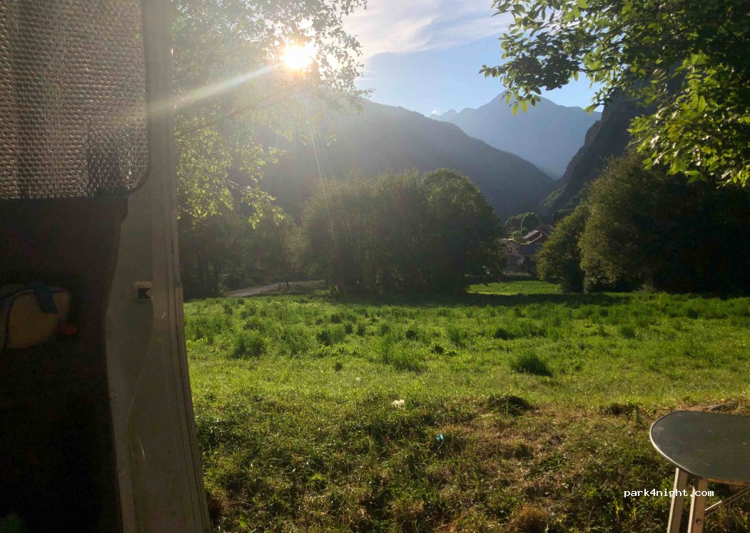 Vlak onder een ongezonde GSM mast. Even ervoor of erna zijn wel nog plaatsen om te staan. Riviertje vlakbij. Mooi uitzicht op steile rotswanden rondomrond. Wel veel muggen. Op de achtergrond hoor je de autosnelweg.