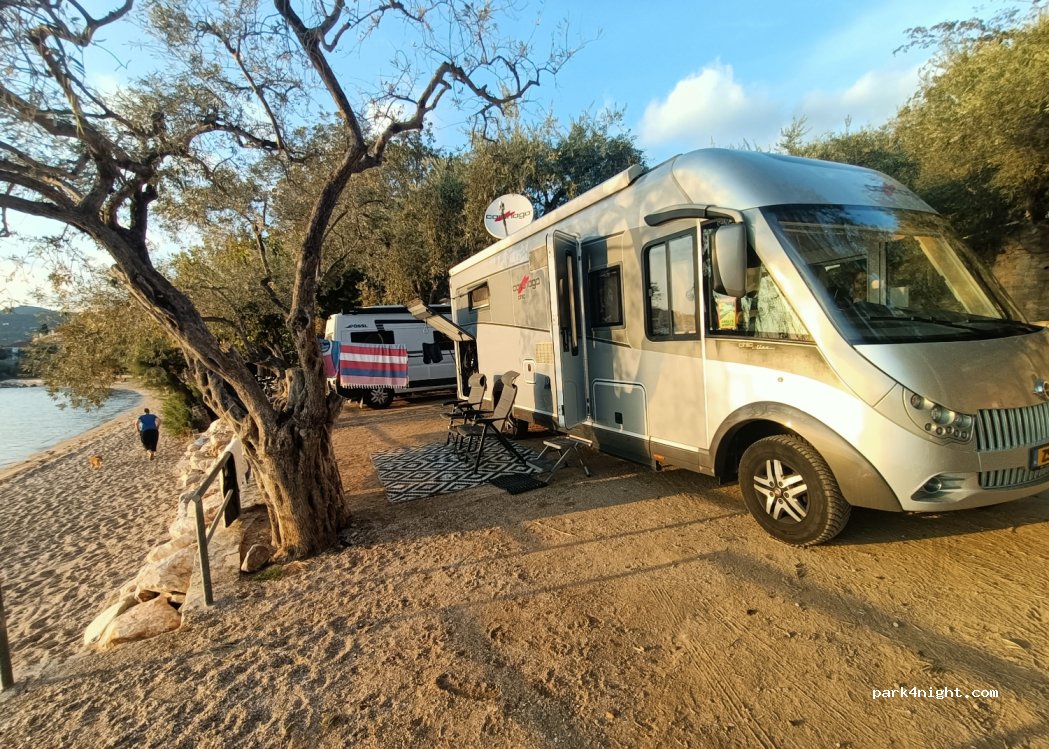 Ein sehr schöner Platz mit idyllischen Stellplätzen unter Olivenbäumen mit Blick aufs Meer. Neue und sehr saubere Sanitäranlagen. Gut gegessen im der Taverne am Strand direkt am Platz. Sehr netter Empfang, man spricht auch deutsch.
