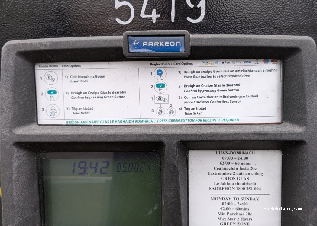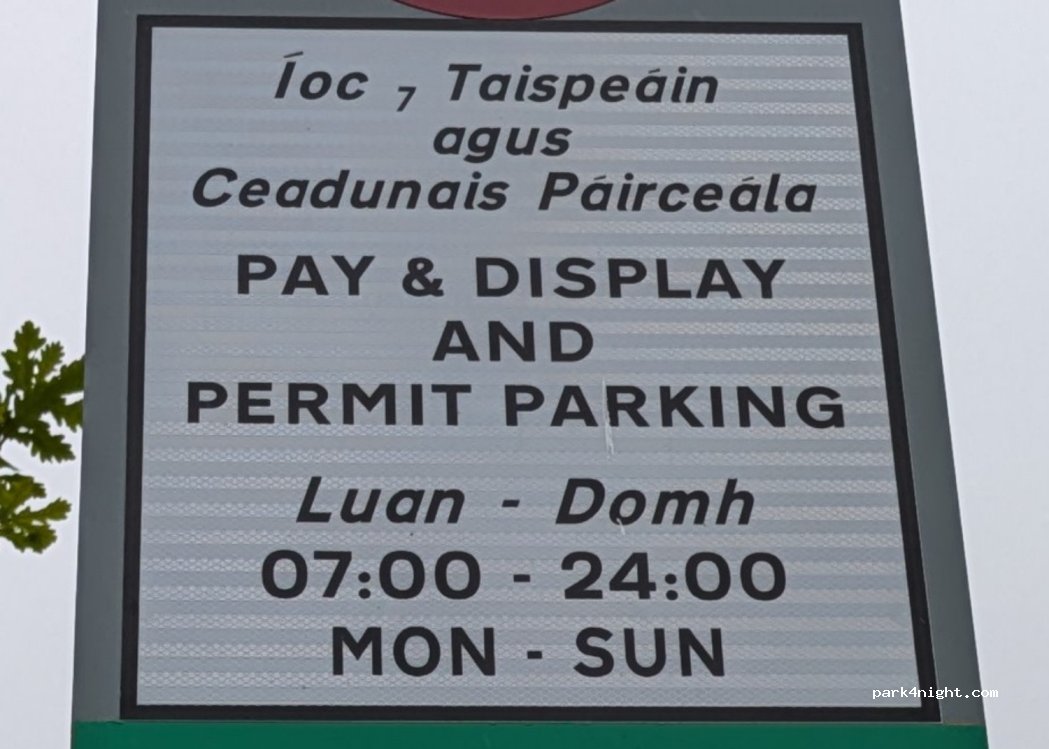 Parking en épi en face du parc. Quartier résidentiel tranquille. Très bon emplacement à 20 mn de Dublin. Le seul problème est qu'il faut un peu monter sur le trottoir pour ne pas dépasser sur la route donc le camping-car est légèrement en pente.
