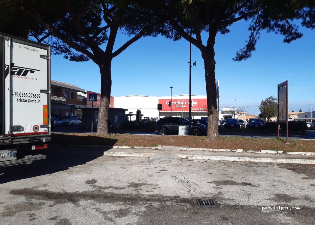 Parcheggio misto auto. Non ci sono fontanelle e i bidoni della spazzatura lì vicino sono solo per i residenti. C'è di buono che è in piano e il centro storico di Grosseto non si trova troppo lontano. Noi non ci siamo fermati a dormire, ma il parcheggio si trova vicino ad una strada abbastanza trafficata di giorno.