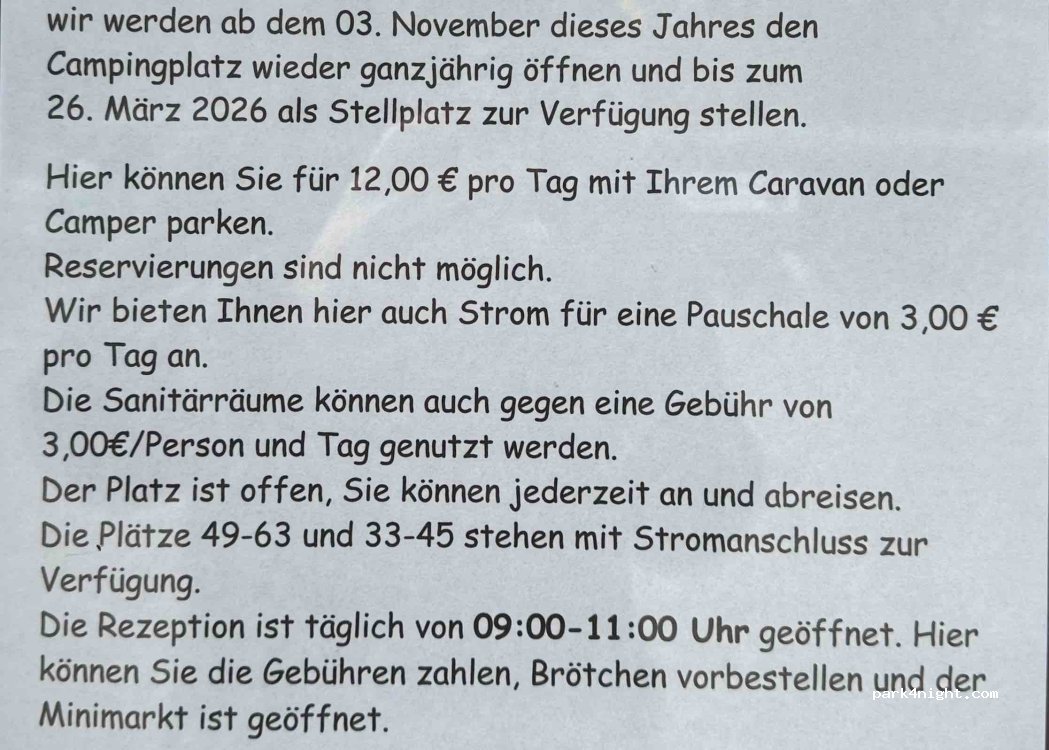 Wir waren für eine Nacht da. Im Winter ist die Rezeption von 9:00 - 12:00 Uhr besetzt. Es gibt auch eine Auswahl an Backwaren. Sollte man später kommen ist neben der Rezeption eine Metall Box mit Umschlägen. Darin ist eine Zugangskarte für die sehr sauberen Sanitär Bereiche wenn man diese braucht. Am nächsten Tag dann einfach bezahlen. Alles unkompliziert und sehr freundlich. Sehr ruhiger Platz.