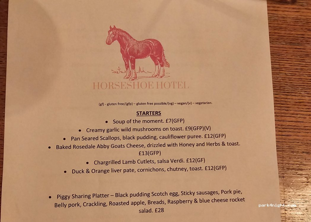 Parcheggio "Horseshoe Hotel", servizi igienici aperti 24 ore su 24 con piccoli lavandini, soggiorno di sabato notte, telefono in anticipo per verificare se era possibile pernottare, il collegamento Elec è facoltativo. Cibo delizioso, personale molto cordiale e attento. I cani "ben educati" sono ammessi al bar e ammessi dopo le 18:00, gli altri cani (cattivi) "non devono presentare domanda". Buona posizione per camminare.