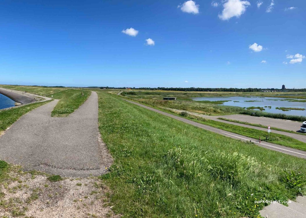 Parkeren geïsoleerd op de teer net achter een duin bij Zierikzee. Vanaf hier zijn verschillende wandelingen mogelijk. Echt heel rustig hier!