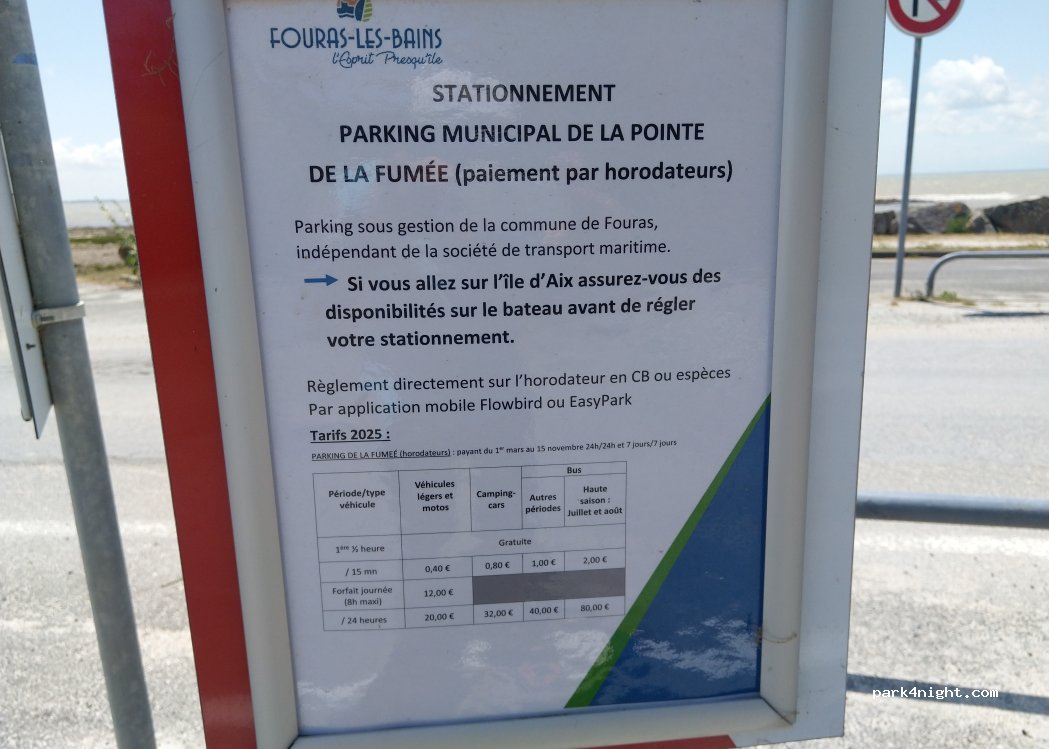 Actuellement les horodateurs ne sont pas en fonction. Nous avons passé 2 nuit agréable bercé par les vagues, pas de bruit, ni de lumière sans dérangement. Les toilette fermé hors saison. Idéal pour visiter l'île d'aix, le centre de fouras est à 30min à pieds. Présence de vendeur et dégustation de fruit de mer sur la route et plusieurs restaurants. Nous y avons passé un nouvel an super.