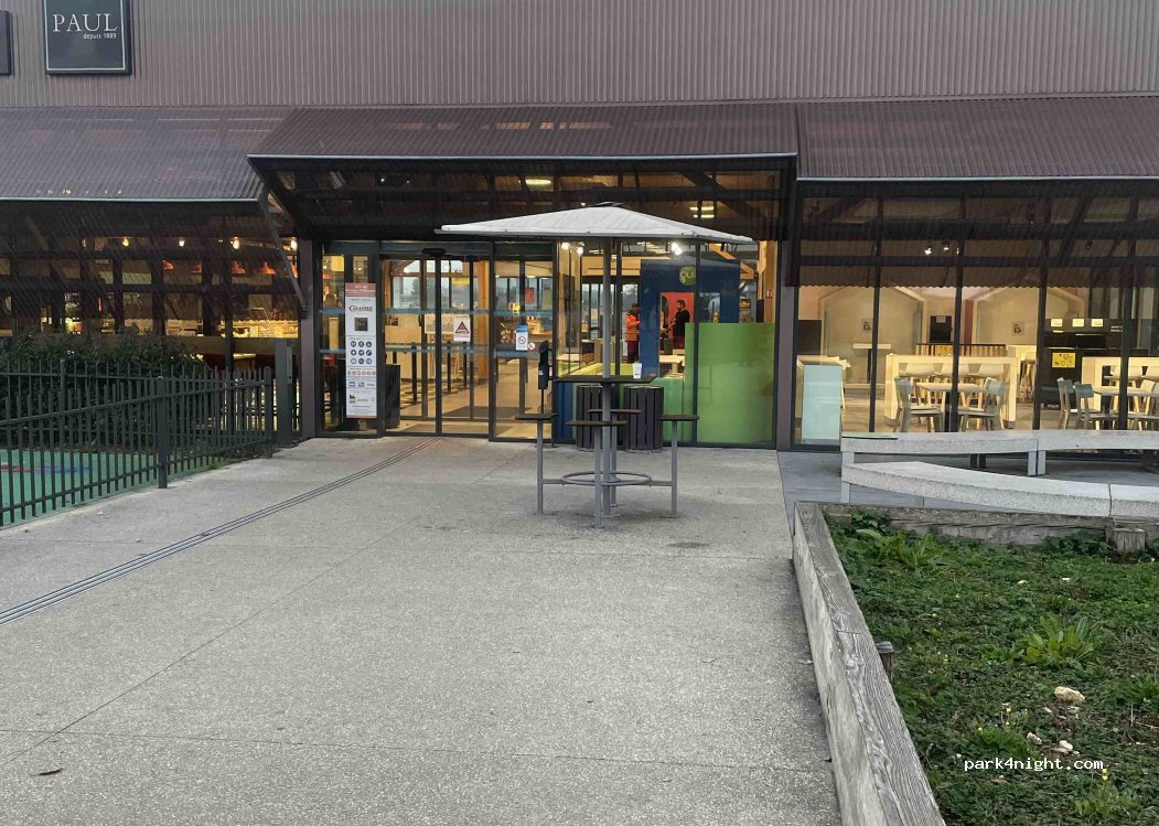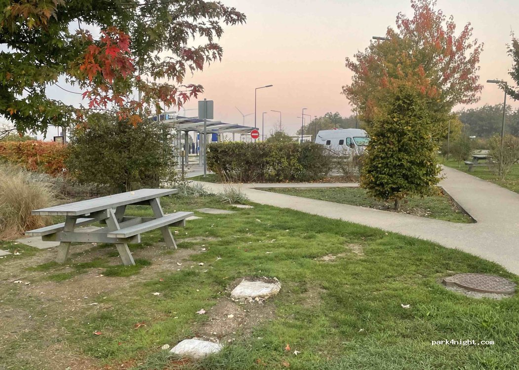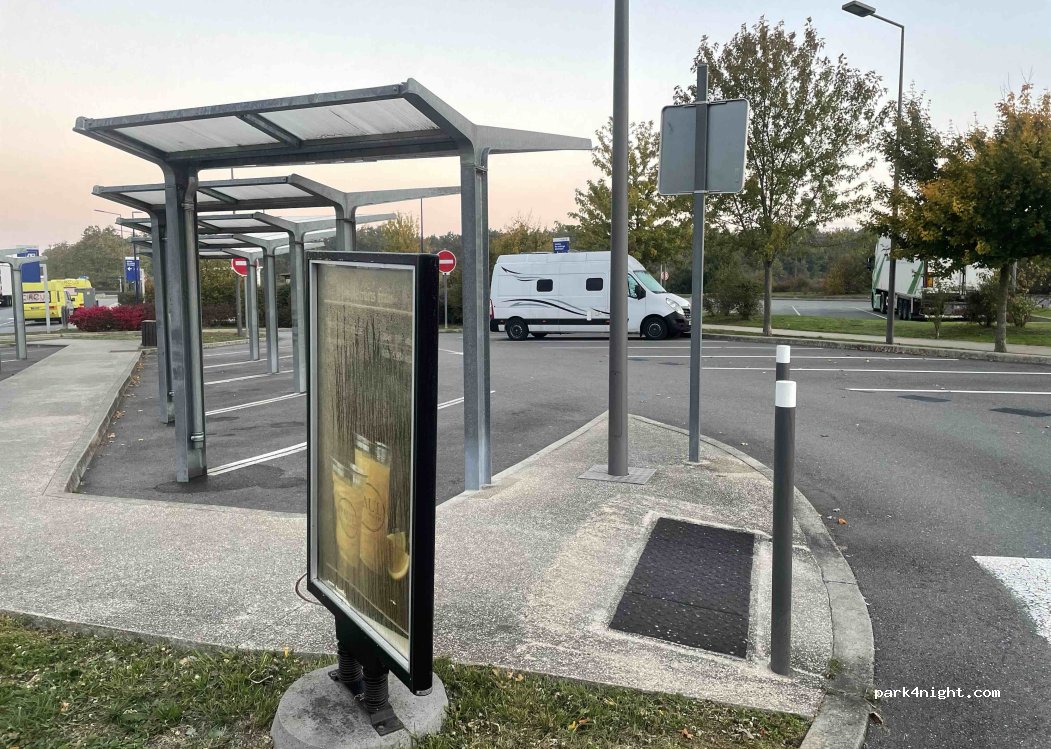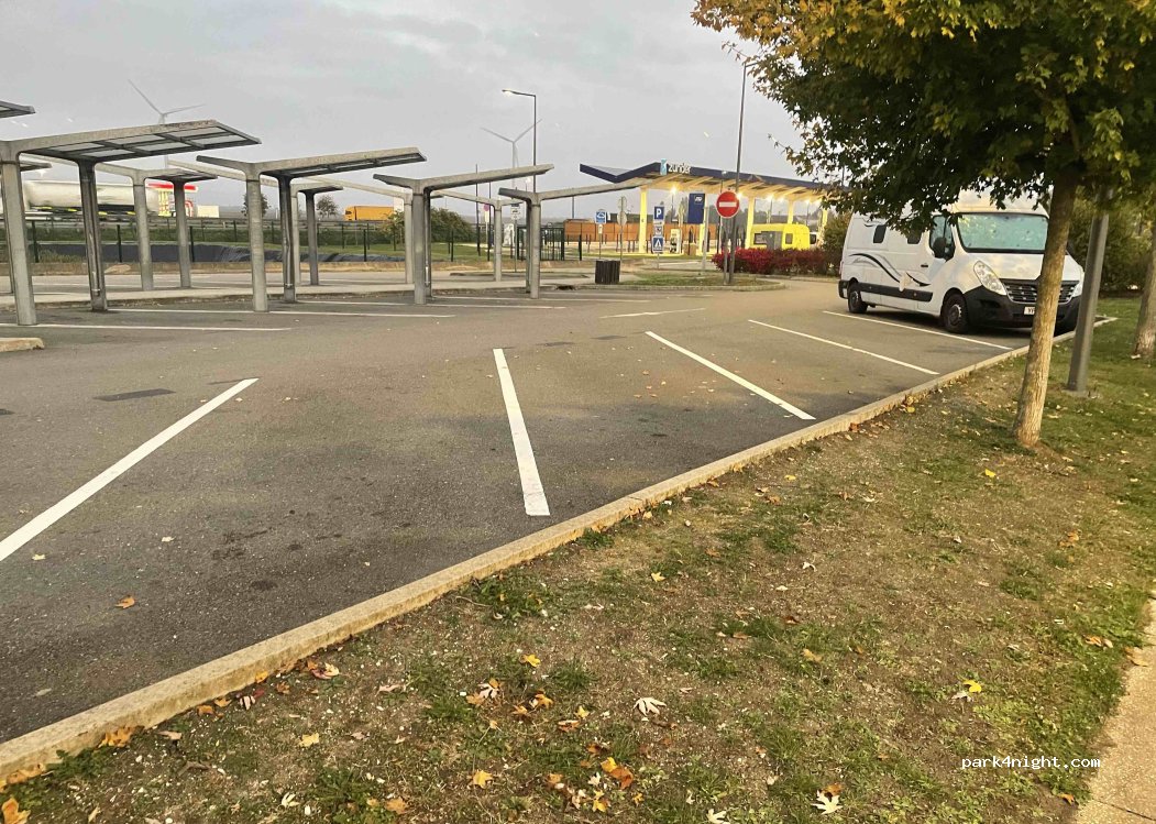 New service station. Very clean toilets and a shower. Nice bakery inside for croissants. 3.2m height barrier to camping car park. Which has covered and uncovered parking. A few tight bends to get in. Our van is 3.2m by 6.3m. We got in slowly and carefully. But bigger vans can park with the wagons. A bit of traffic noise as expected. We would definitely stay again. 15 places.