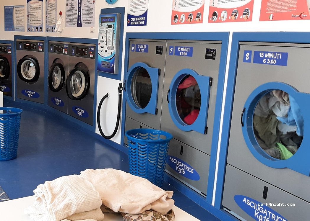 Lavanderia proprio accanto al posto camper a pagamento con elettricità e doccia. Distributore automatico di caffè, bibite e snack. Possibilità di collegare un computer portatile se si desidera lavorare mentre si fa il bucato.