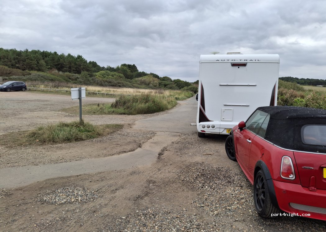 You can overnight park at the side of the car park. There is space for 4 campers on the access road to the left as you enter the area. You cannot park in the car park. Beautiful pebble beach, very quiet overnight.