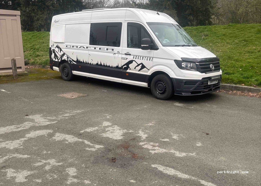 We stayed here in the car park no problem accept boy racer meeting at TOP end of car park. Park at very bottom nearer the river for a quieter night. Felt safe as police patrolling..Fantastic cycle route along river and Montgomery canal to Welshpool.