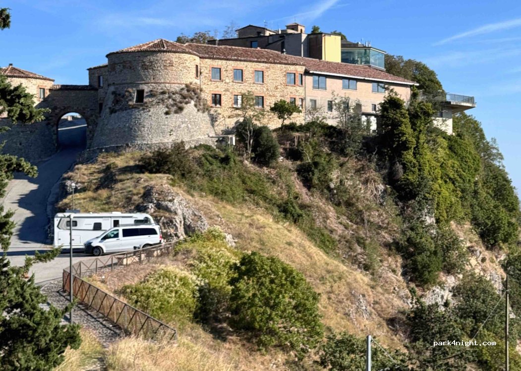 Unglaublich schöner Platz. Ziemlich ruhig in der Nacht und am Morgen nur leicht belebter. Die Aussicht in das Tal und auf San Marino ist vor allem beim Sonnenaufgang besonders toll. Ein Spaziergang durch die Burg rundet den Aufenthalt ab.