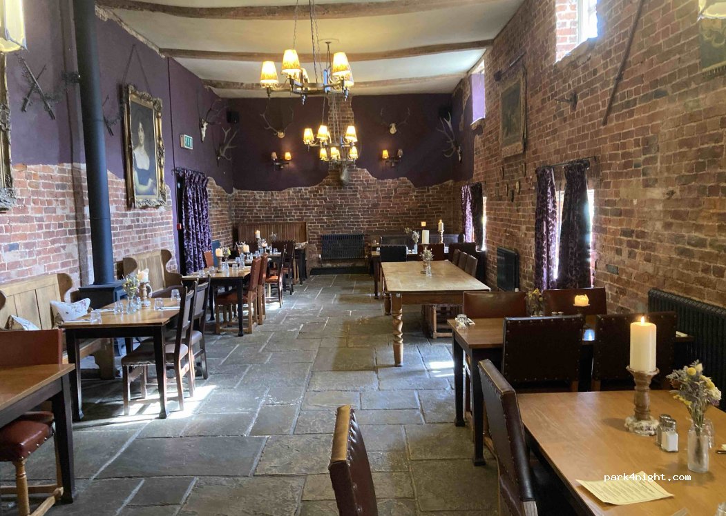 Nice, quiet and level parking area. Lovely staff, opened the premises early to enable toilet use (if needed). Meals not cheap but a good choice. Breakfast available from 0930-1130. Photo of dining room and outside garden appended. Nice ciders! A small, day ticket, coarse fishing lake is just over the road if you fancy a go.